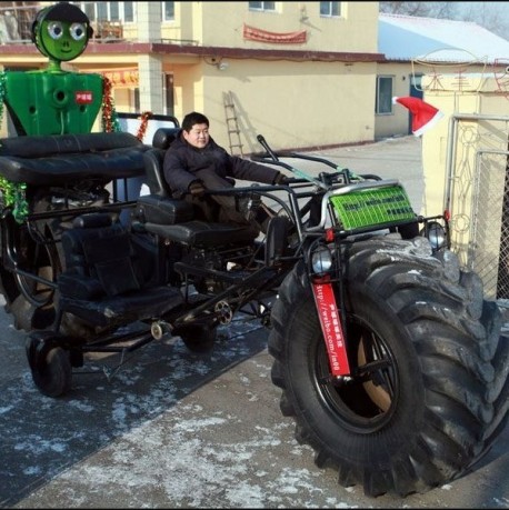 Here we have a very strange monster bicycle from China. ‘Bicycle’ indeed, it doesn’t have an engine, it is powered by good old fashioned human leg-power. The incredible machine resides in the great city of Jilin in Jilin province and was made by a very handy father for his son’s birthday. What a present, “Now go my son, hit those pedals hard I tell you!” A few more pics:
