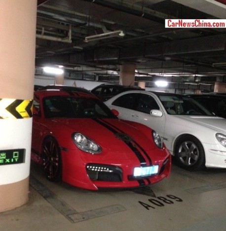 A very racy Porsche Cayman coupe, seen in the great city of Shenzhen in Guangdong Province by reader Josh F., thank you for the pictures! The good vehicle was pimped the max, painted in fiery red and fitted with a fatass body kit. Black racing stripes start on the front lip and continue all the way over the roof.