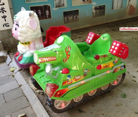 A very dangerous green-crocodile-tank coin operated kiddie ride, seen on a residential compound just east of the Fifth Ring Road. The crocodile theme makes this tank a far more fearsome weapon than a sorta similar red tank we met earlier in the same area. It also is a rather big machine, measuring a full 1.2 meters in length.