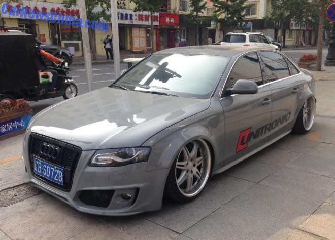 A spectacular Audi A4L lowrider, Spotted in China in the great city of Dalian in Liaoning Province. The good Audi is lowered to the max, hovering the street, and further fracked up with a badass body kit, a black grille, a darkened front window, black side and rear windows, fuzzy stickers, and sporty 7-spoke matte gray alloys.