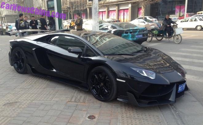 A lunatic Darth Vader DMC Lamborghini Aventador LP988-4 Edizione GT supercar, Spotted in China in the great city of Zhengzhou in Henan Province. The vehicle looks absolutely bomb, with an all black body, black windows, and fitted with black alloys and black brake calipers.