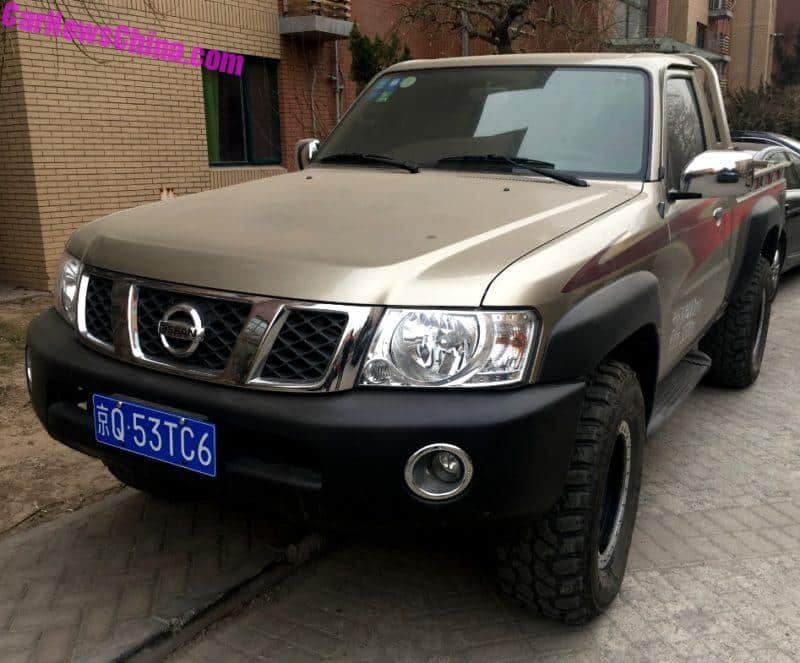 A massive Nissan Petrol pickup truck, Spotted in China in my compound in east Beijing. It is a truly enormous vehicle, towering tall over anything else on the street.