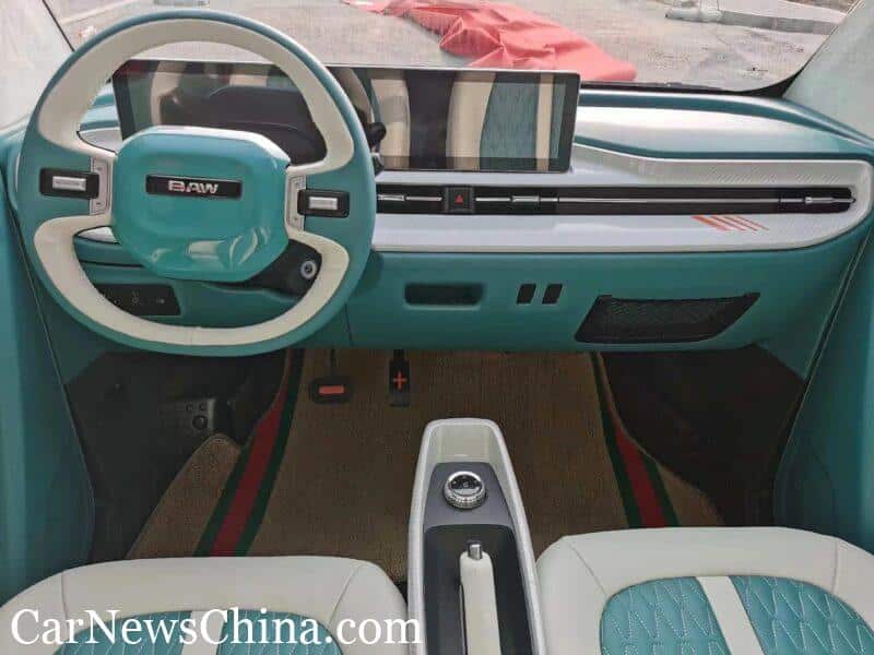 The BAW S3 is very similar to the Wuling in concept and in size. It measures 3151/1498/1585, with a 2050 wheelbase. Design is nice, albeit a little predictable, with a honeycomb ‘grille’, large headlights, and a trendy two-tone paint job. The car on stage was painted in a vague shade of pink that is very popular in China at the moment.