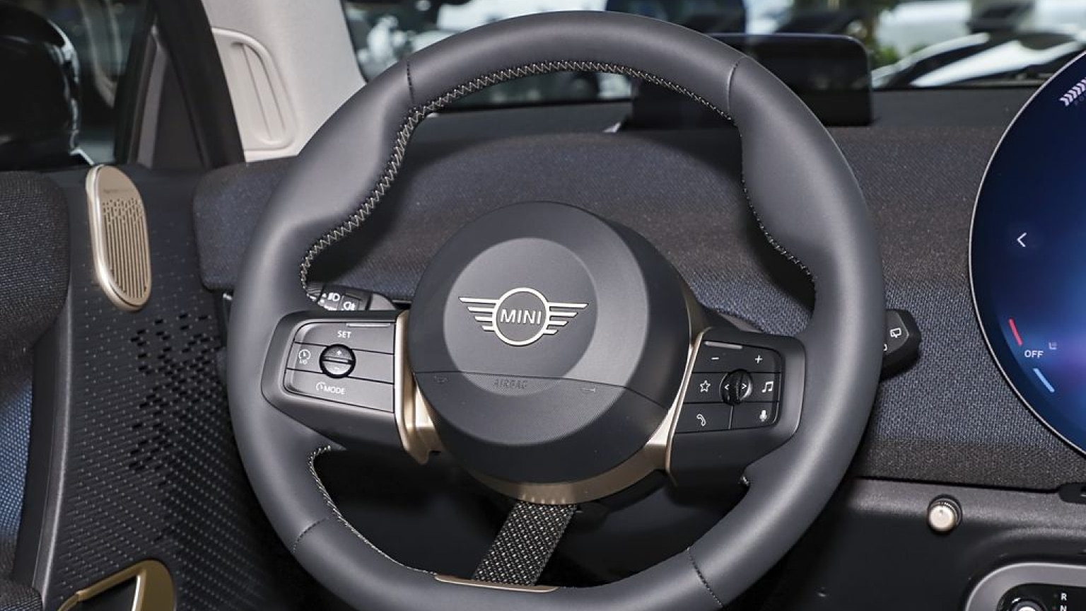 Inside, the Mini Cooper EV follows the brand’s funky styling with a large circular OLED screen on the center console. The diameter of this monitor reaches 9.5 inches (240 mm). It runs on Mini OS 9. The Mini EV hasn’t got a conventional dashboard. Instead, it has a heads-up display, which sits behind a three-spoke steering wheel. The gear shifter and power switch of the electric Mini Cooper sits in the center console.