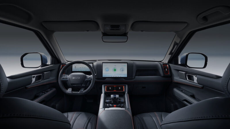 The BYD Shark is a large pickup truck with sturdy exterior styling and dimensions of 5457/1971/1925 mm. Its wheelbase stretches to 3,260 mm. It has five seats inside and a loading bed with a volume of 1,450 liters & a maximum payload of 835 kg. The center console of the Shark has a 12.8-inch touchscreen and many physical buttons.