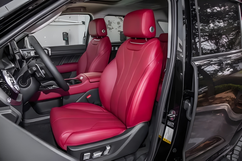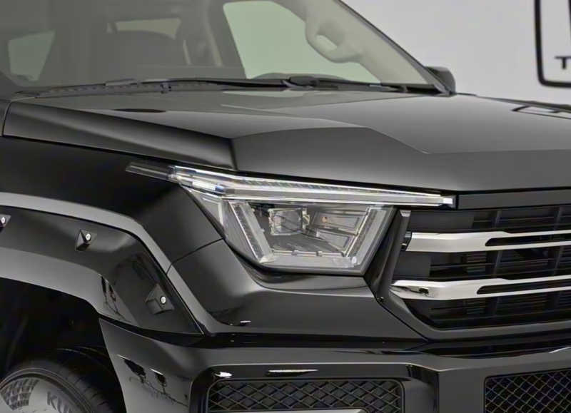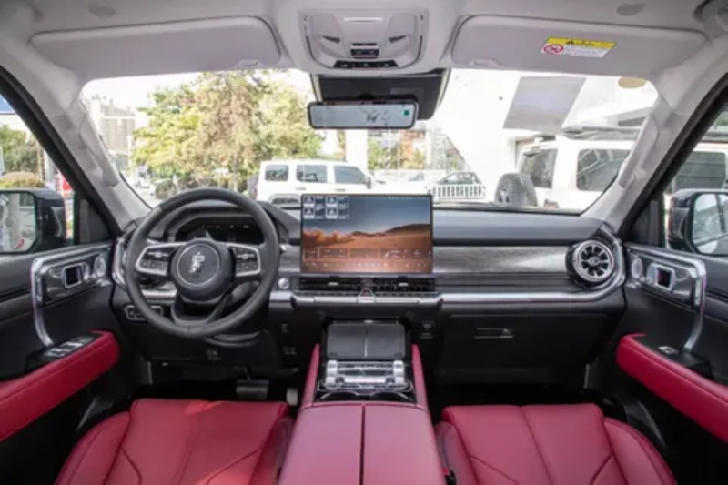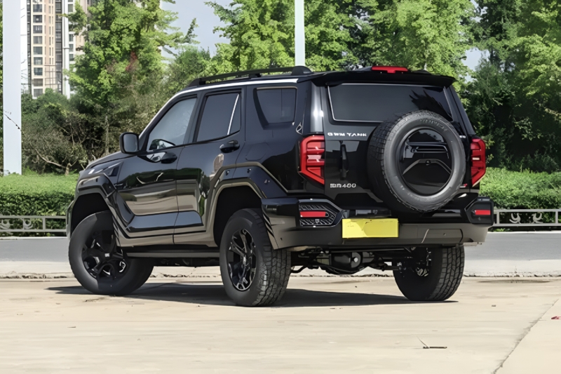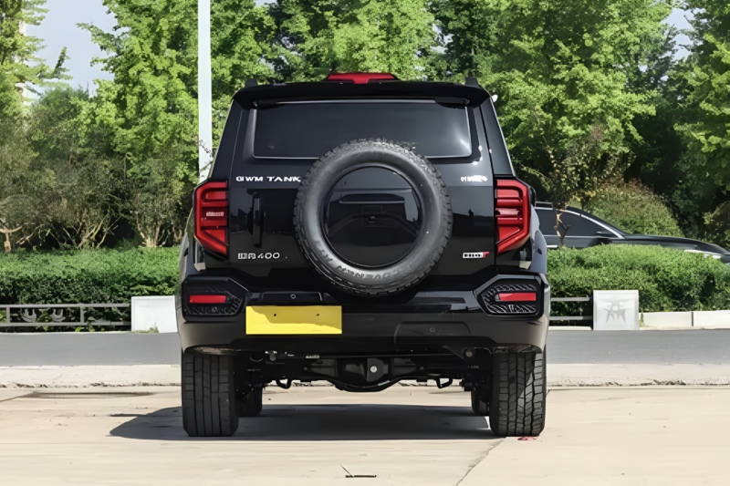 The Tank 400 retains its armoured, mechanical design language but adds visual updates. The front features a narrow hexagonal grille with two horizontal chrome bars and polygonal headlamps. The new front bumper is more squared-off, featuring high-power LED fog lamps that reach 31.6 meters. Black trim accents and a far-infrared night vision system are included.