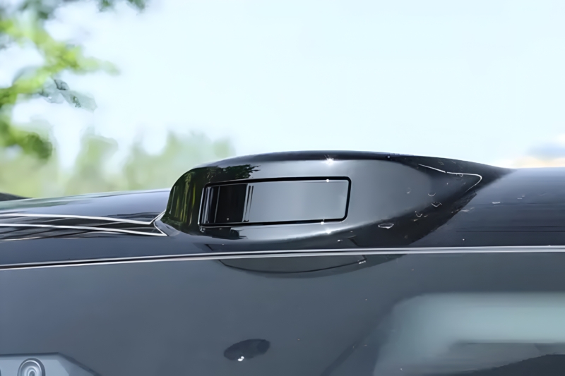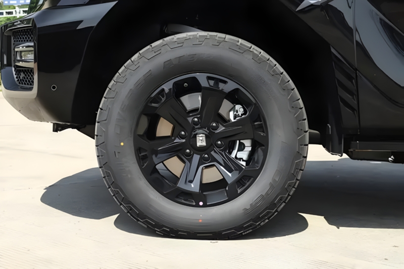The side profile remains essentially unchanged, with exposed rivets on the fender flares. The Hi4-T version has retractable side steps, while the Hi4-Z features fixed steps. Dimensions are 4,964 mm long, 1,970 mm wide, and 1,905 mm tall, with a 2,850 mm wheelbase. The rear retains an externally mounted spare wheel with a quick-release cover and polygonal taillights. Exterior colours include Phantom Black, Wing Silver, Nebula Grey, and Dunhuang Purple.