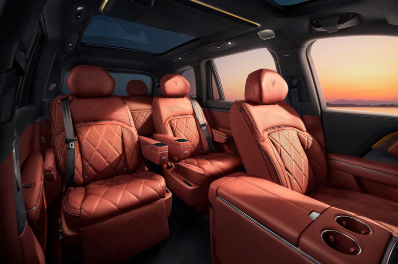 The Voyah Taishan interior adopts six seats with a 2+2+2 layout. The second row adopts two captain chairs with touchscreens and cup holders in the armrests. Both seats adopt a power leg rest, phone charging, and speakers in the headrests. This high-end equipment contradicts cheap-looking black seatbelts. Other Taishan features include a built-in refrigerator, folding tables, a split sunroof, and a ceiling-mounted screen.