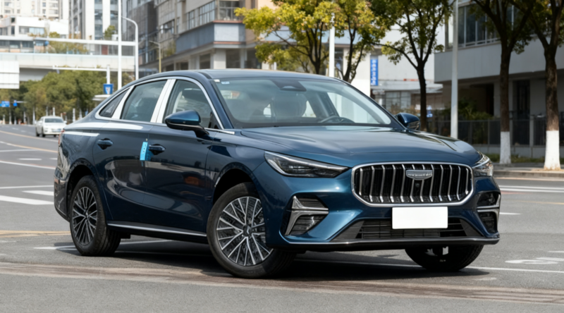 Externally, the new Emgrand features a polygonal waterfall-style grille with 12 vertical chrome trim strips, alongside redesigned headlights that offer an illumination range of over 170 meters. The front bumper includes dual L-shaped decorative elements near simulated air intakes. At the rear, narrow taillights are connected by a plastic panel bearing the “GEELY” logo, with additional silver trim and dual exhaust outlets. The model offers six body colours, 17- and 18-inch alloy wheel options, and traditional pull-type door handles.
