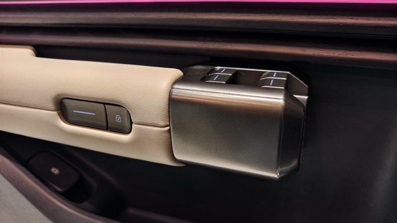 Flush door handles, frameless windows, and a drag coefficient of 0.22 all contribute to enhanced aerodynamic efficiency. Subtle shoulder lines and the “dual-arch” rear design create visual width and improve airflow, while the air suspension automatically lowers the body at higher speeds. The 20-inch Pirelli PC5 Elect tyres, with integrated foam, reduce rolling noise and contribute to a composed ride. Black window surrounds and unpainted lower panels lend a technical, understated look rather than a decorative one.