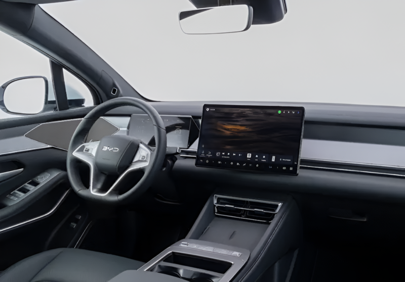 Inside, BYD uses layered geometric surfaces and a central “ridge” motif inspired by traditional Chinese rooflines. The main dashboard features bamboo-wood trim with three-dimensional cutouts for a cleaner, more structured appearance. Brazilian media reports indicate that the Atto 8 retains the large rotating central touchscreen and digital instrument cluster used in the Chinese version. However, final equipment levels may vary to meet local certification requirements.