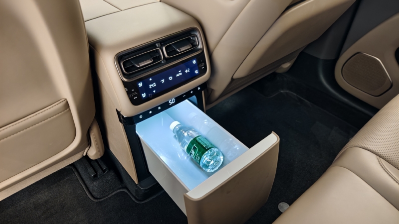 Utility-wise, Li Auto has integrated familiar conveniences: standard front wireless charging pads, generous door-pocket and door-panel storage, and a refrigerator in the rear cabin. The 21.4-inch ceiling-mounted rear entertainment screen was present on our test car; mounted closely yet at a suitable viewing distance for rear-seat occupants, it did not interfere with front-seat adjustments. Window sunshades, soft seat surfaces, and a generally flat floor contribute to a practical daily environment. The panoramic windows, including a large rear side window and an optional large fixed glass area overhead, enhance the sense of space and openness.