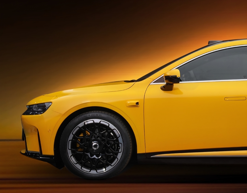 In terms of design, most notably, the yellow exterior paint, yellow brake calipers, sloping roofline, and the electrically adjustable rear wing further emphasize the sporty nature of the vehicle.