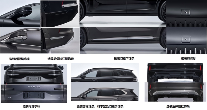 Furthermore, other optional configurations include side mirror base design, front & rear bumper trim, roof rack and door handle trims, logo lettering, fender camera cover, and digital rearview mirror.
