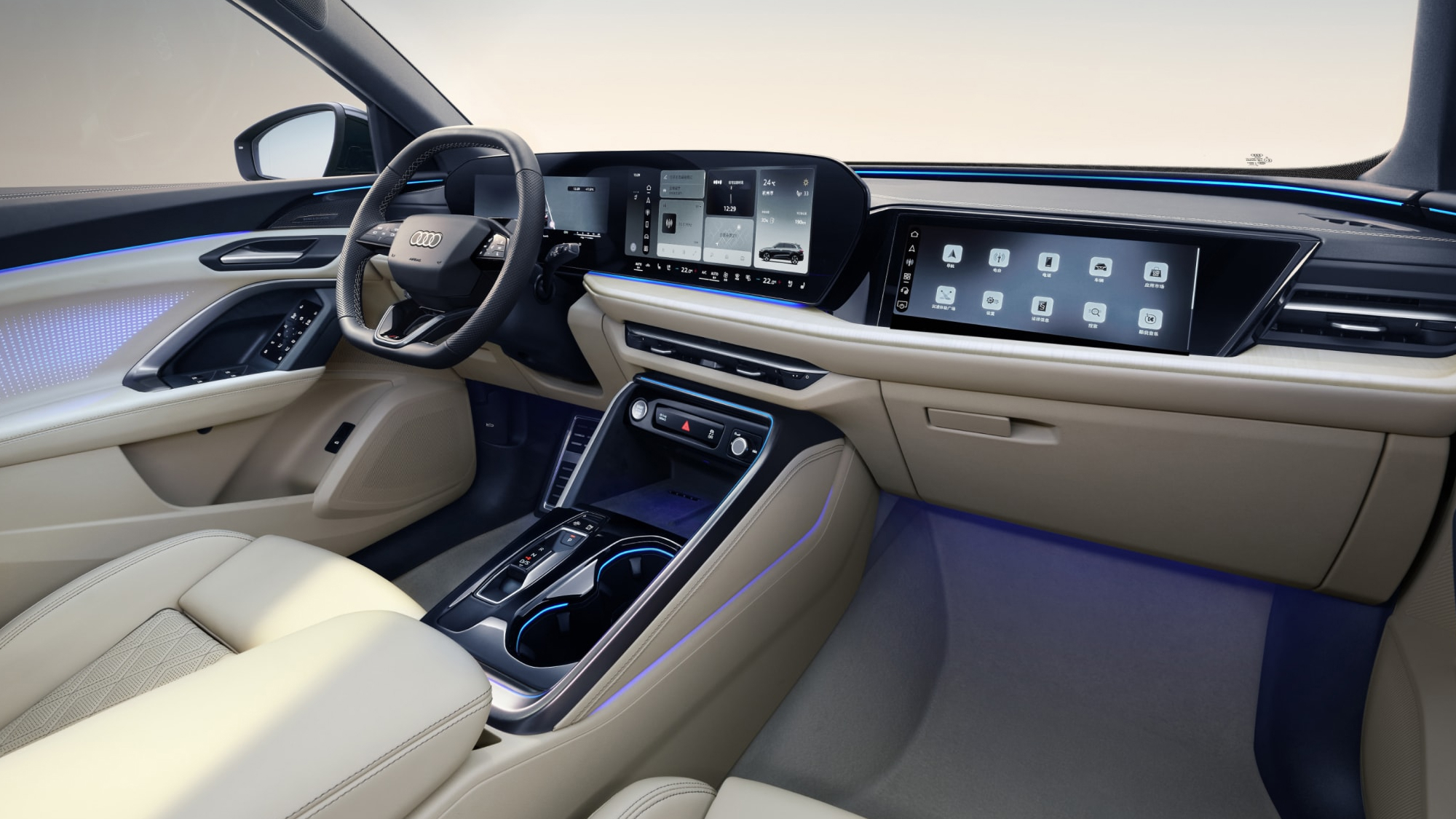 The Audi Q5L’s interior offers three screens: an 11.9-inch instrument panel, a 14.5-inch OLED central touchscreen, and a 10.9-inch monitor for the front passenger. It is also available with a 13.1-inch head-up display. It supports overlay route planning with real-world road views. Other features include wireless phone charging pads, ambient lighting, a Bang & Olufsen sound system for 16 speakers, and heated seats.
