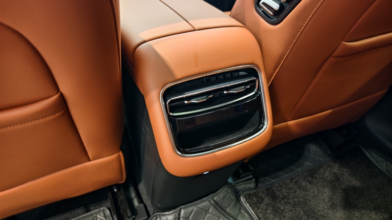 Seating integrates leather covers with Alcantara accents. Rear cabin space benefits from the 2,800 mm wheelbase, offering approximately four fingers of headroom for an 185 cm adult. Rear seats fold in a 4:6 ratio to expand cargo volume. The materials are tightly fitted, the triple-screen assembly shows minimal gaps, and panel alignment demonstrates consistent build quality. USB-C ports and a central armrest are positioned for passenger convenience without obstructing legroom.