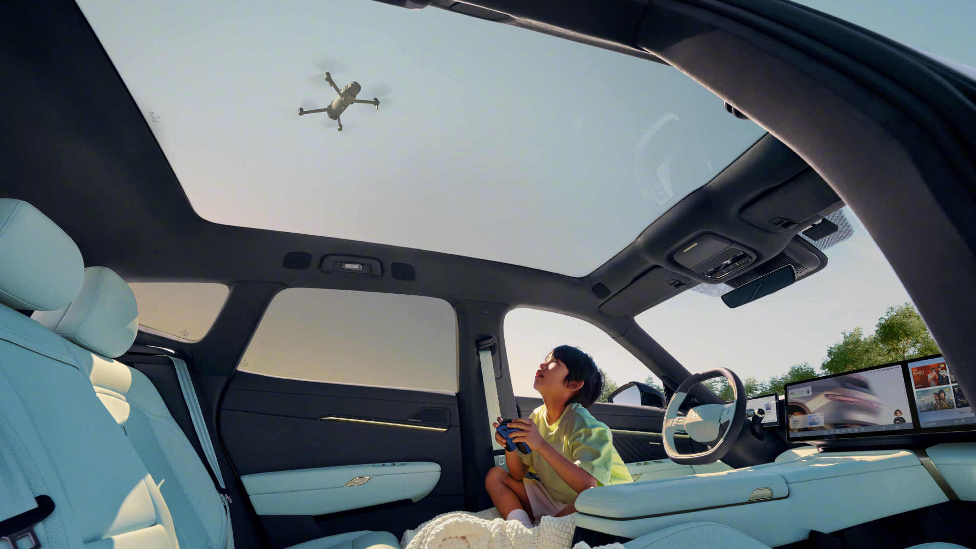 The car’s interior adopts a block of two 15-inch screens. The vast majority of modern Chinese new energy vehicles offer the same layout. There is a small LCD instrument panel behind a two-spoke double-D-shaped steering wheel. The gear shifter sits on the steering column, leaving space for two wireless phone chargers on the center tunnel. The car’s front seats adopt power adjustments, 10-point massage, ventilation, and heating. Another feature is a 6.7-liter refrigerator.