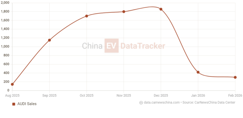 AUDI is a joint brand between Volkswagen and SAIC aimed at Chinese customers. It currently sells a single model in China, which is the E5 Sportback shooting brake launched in August 2025. According to China EV DataTracker, AUDI’s cumulative deliveries reached 7,373 units, with just 303 cars handed over to clients in February. The next step for AUDI is the launch of an electric SUV.