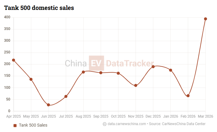 According to China EV DataTracker, Tank 500 domestic sales in China showed fluctuations over the past year before a sharp increase in early 2026. Monthly sales declined from around 210 units in April 2025 to approximately 25 units in June 2025, before recovering to the 150-170 unit range between August and October.