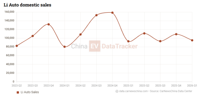 In early 2026, sales trends began to shift. Li Auto delivered 95,100 vehicles in the first quarter, with March deliveries reaching 41,100 units, up 173% year-on-year. The i6 battery electric SUV accounted for over 24,000 units in March, becoming a primary driver of growth.