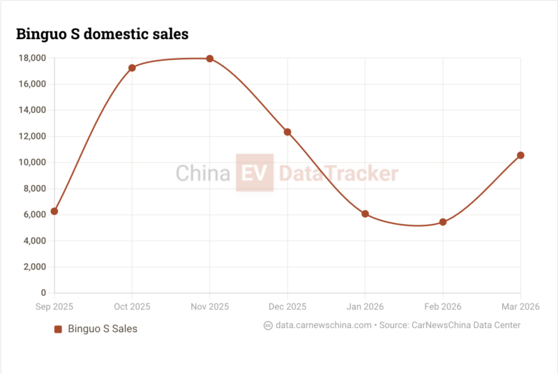 The Binguo S was launched last September and received over 55,000 orders within 48 hours of its release. This model reached its sales peak in November last year, selling nearly 18,000 units in the Chinese market. After a decline in January and February of this year, sales bounced back to over 10,000 units in March.