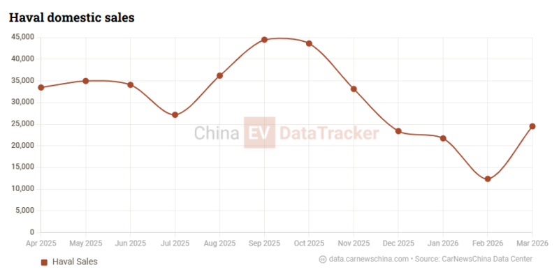 Haval’s domestic sales have shown notable volatility over the past year. Monthly volume peaked at around 44,000 units in September 2025, then declined through late 2025 and early 2026. Sales dropped to approximately 12,000 units in February 2026, then recovered to around 24,000 units in March. Compared with the mid-2025 peak, this represents a significant decline, indicating pressure on the brand’s core SUV segment despite short-term rebounds.
