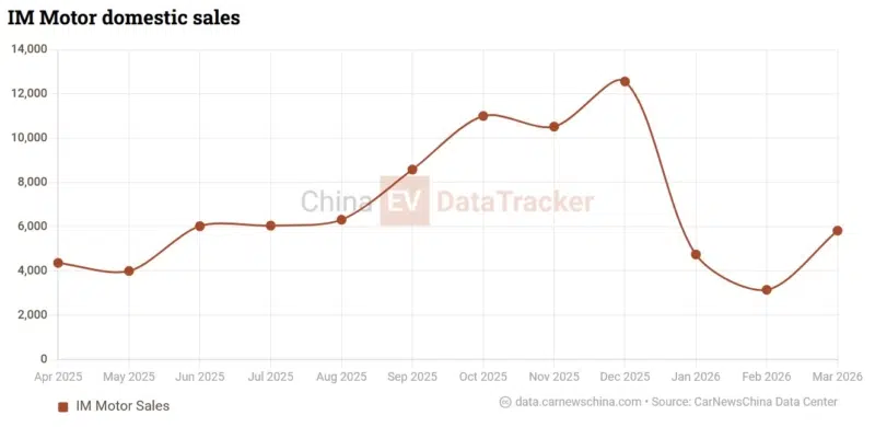 According to China EV DataTracker, IM Motors delivered 5824 units domestically in March 2026. Apart from October, November, and December of 2025, monthly sales have not gone beyond 10,000 units. This brief peak coincides with the termination of favourable PHEV and EREV subsidies at the start of 2026.