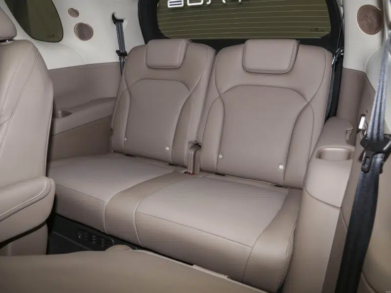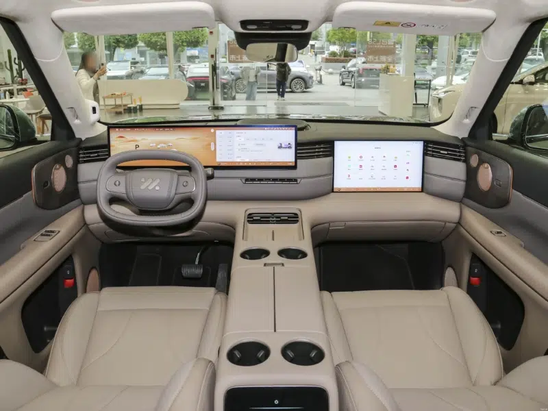 The LS8’s interior uses a wrap-around design, pairing a 27.1-inch 5K MiniLED center screen with a 15.6-inch 3K screen for the passenger. The infotainment system is powered by a Qualcomm 8295P chip, while an optional B&O sound system brings 25 speakers into the interior.