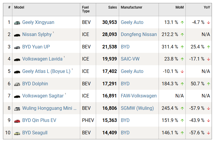 Recent model-level data shows a mixed picture within the segment. The Geely Xingyuan led with 30,953 units, followed by Nissan Sylphy at 28,093 units, while EVs such as BYD Yuan Up (21,538 units) and BYD Dolphin (17,291 units, +50.7% YoY) remained among the top sellers.
