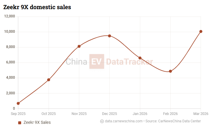 CarNewsChina data (China EV DataTracker) shows the Zeekr 9X recorded fluctuating domestic retail performance over its initial months, with sales rising from 686 units in September 2025 to 10,060 units in March 2026. Monthly growth showed strong volatility during early ramp-up, reflecting typical launch-cycle behaviour in China’s premium SUV segment.