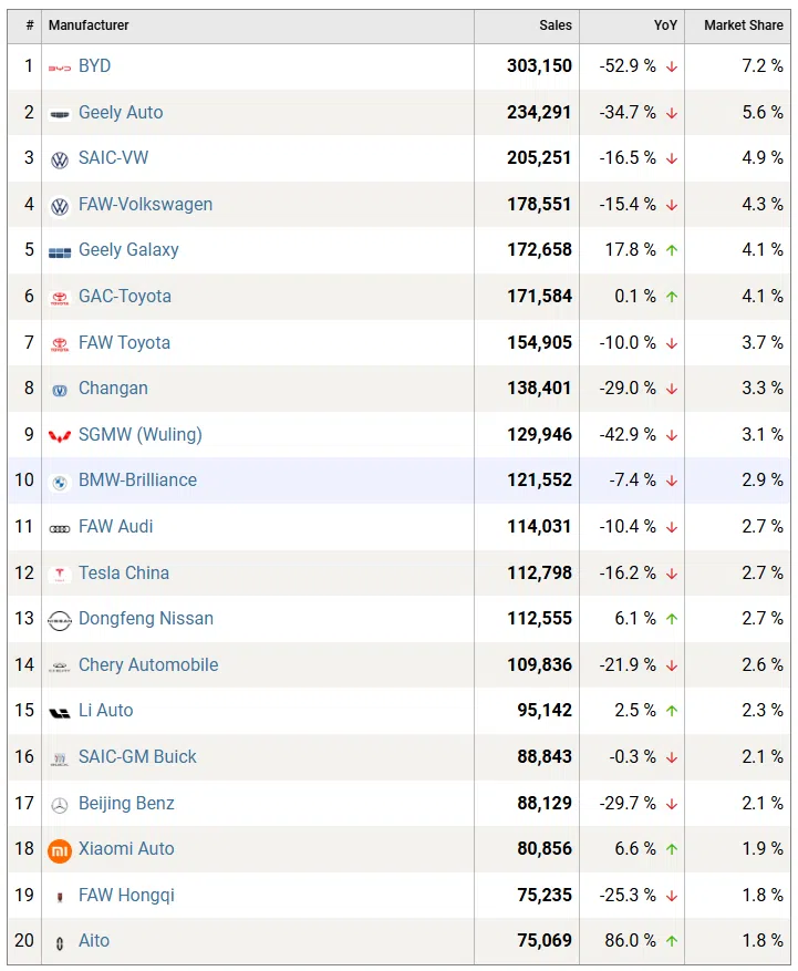 In contrast, Geely Galaxy (+17.8%), Dongfeng Nissan (+6.1%), Li Auto (+2.5%), Xiaomi Auto (+6.6%), and Aito (+86.0%) posted growth, indicating continued momentum among select electrified and new-energy-focused brands. Tesla China recorded 112,798 units, down 16.2% YoY, while traditional premium joint ventures like BMW-Brilliance and Beijing Benz also declined. Overall, the dataset reflects a mixed market environment, where legacy joint ventures face pressure while newer NEV-focused brands and sub-brands show pockets of expansion.