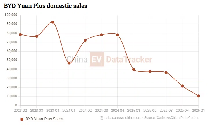 According to China EV DataTracker, BYD Atto 3 sales in China reached 10,675 units in the first quarter of 2026, representing a 73.2% year-on-year decline. Monthly volumes have fallen to around 2,000 units in early 2026 after previously exceeding 10,000 units.