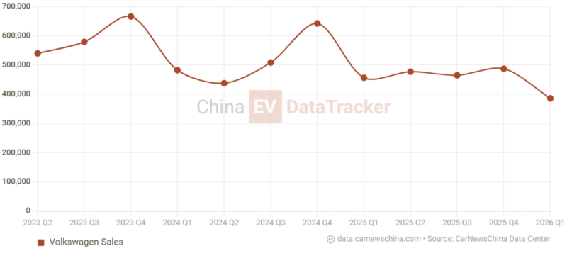 Volkswagen delivered 386,284 units in China, down 15.4% Year-Over-Year. The brand actively enters the new energy vehicle segment as the share of cars with internal combustion engines shrinks in China.
