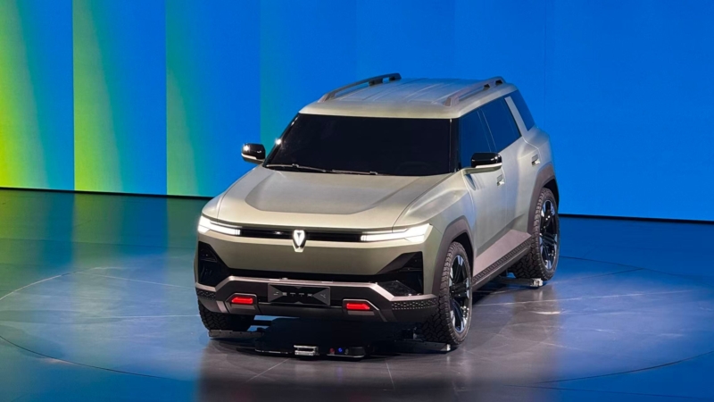 What the company did show was the design. The concept has a boxy shape, pronounced fenders, trapezoidal wheel arches with black cladding, narrow LED light signatures front and rear, and skid-plate style trim with red tow hooks. The interior follows a minimalist layout with large screens and few physical controls.