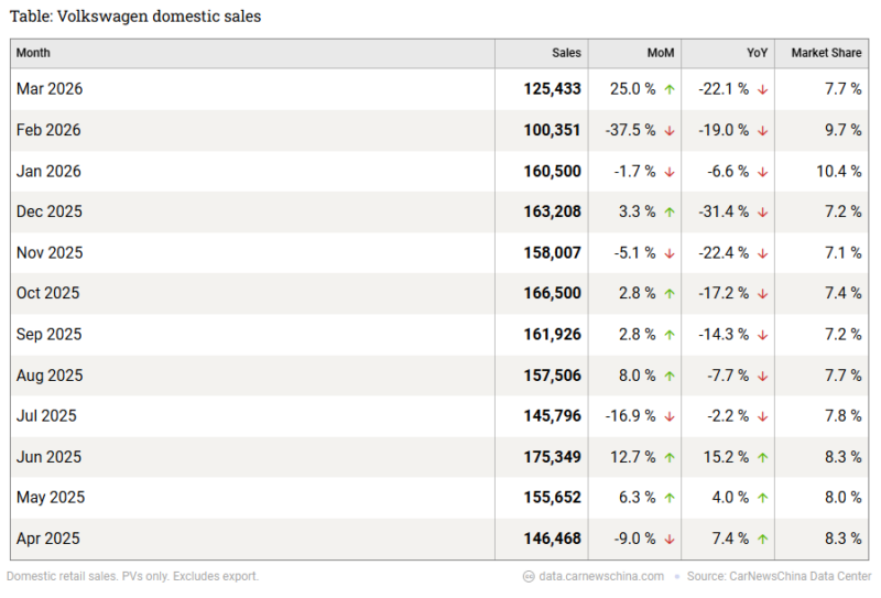 Volkswagen is battling falling sales in China as ICE car sales are shrinking and its electric models don’t sell well there. The German brand sold 125,433 cars in China in March, down 22.1% from the same month last year, continuing the ninth consecutive month of year-over-year sales decline.