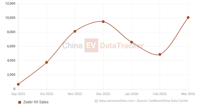 Throughout the first quarter of 2026, the 9X has consistently been a core pillar of Zeekr’s delivery mix, accounting for over 30% of the brand’s total volume. Its strongest performance to date occurred in March 2026, when it reached 10,060 units, a 106.2% recovery following a seasonally lower February. During that month, the 9X accounted for 41.3% of all Zeekr sales in China, confirming its role as a primary driver of the brand’s high-margin revenue.