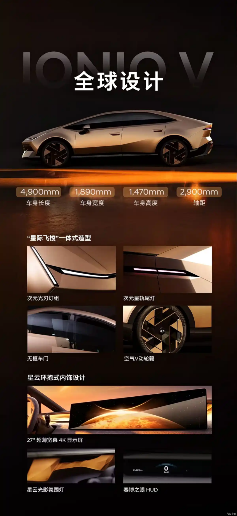 Additionally, the all-new Ioniq V made its global debut at this auto show. The vehicle features a multi-faceted three-dimensional design with low wind resistance styling, “Dimensional Light Blade” light clusters, and a split headlight design. The side profile showcases frameless doors and V-shaped wheels. In terms of dimensions, the new vehicle measures 4900/1890/1470mm in length/width/height, with a wheelbase of 2900mm. The rear features “Dimensional Star Track” taillights.