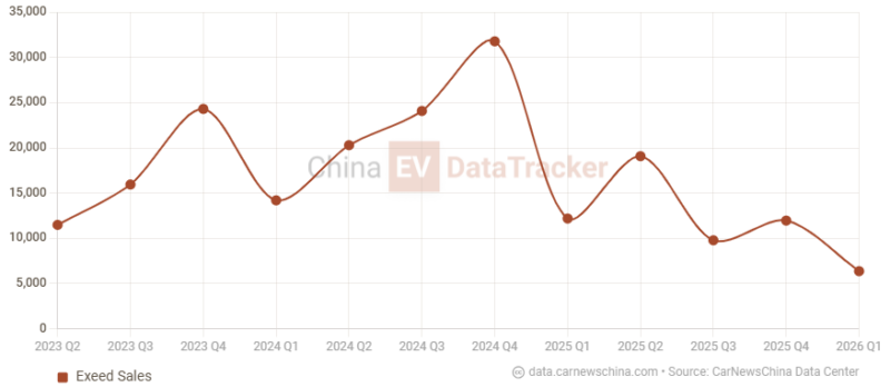 Reported sales data from China EV DataTracker shows that Exeed’s monthly volumes have varied over the past year, with higher levels in late 2024 and lower levels reported in early 2026.
