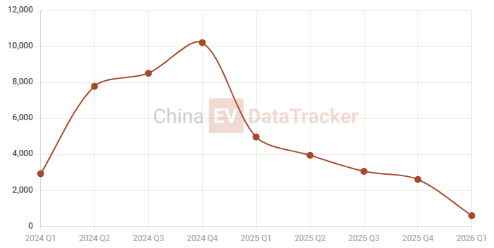 According to China EV DataTracker, Chery Fulwin A9’s smaller sibling A8 domestic sales reached 593 units in 2026 Q1, down 88.0% year over year and 77.2% quarter over quarter. This compares with 2,606 units in 2025 Q4 and 4,962 units in 2025 Q1.