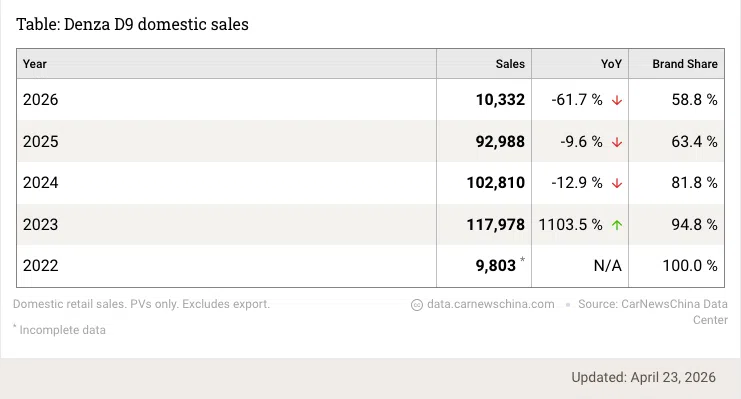 Launched to the public in August 2022, the D9 is the top-selling new energy MPV in China, it sold 117,978 units in 2023, 102,810 units in 2024, and 92,988 units in 2025, it delivered its 300,000th vehicle last November.
