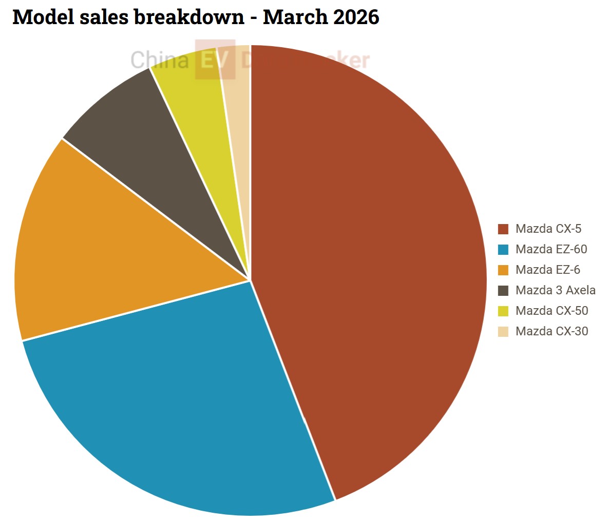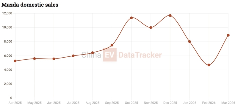 According to China EV DataTracker, Mazda delivered a total of 91,061 units from April 2025 to March 2026. It can be seen that Mazda’s electrification strategy in China is working, having beaten the firm’s own sales estimate of 76,000 units by almost 20%. The combined sales of the 6e (EZ-6) and CX-6e (EZ-60) make up more than 40% of Mazda’s monthly figures in Q1, with total Q1 NEV sales making up 47% of the quarterly figure.