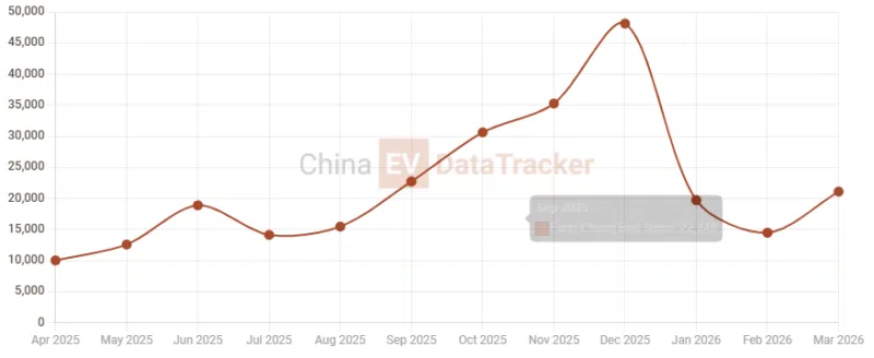 According to China EV DataTracker, Fang Cheng Bao has recorded strong but fluctuating growth in 2026. March sales reached 21,120 units, up 162.3% year-on-year, following a peak of 48,161 units in December 2025. This reflects continued expansion from early SUV-focused positioning into broader product categories.