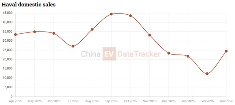 Haval’s domestic performance continues to fluctuate. In March 2026, sales reached 24,520 units, down 19.7% year-on-year, following a weaker February at 12,391 units. Earlier months in late 2025 also showed sharp declines, reflecting broader segmentation pressure from both internal Tank lineup overlap and external hybrid competition.