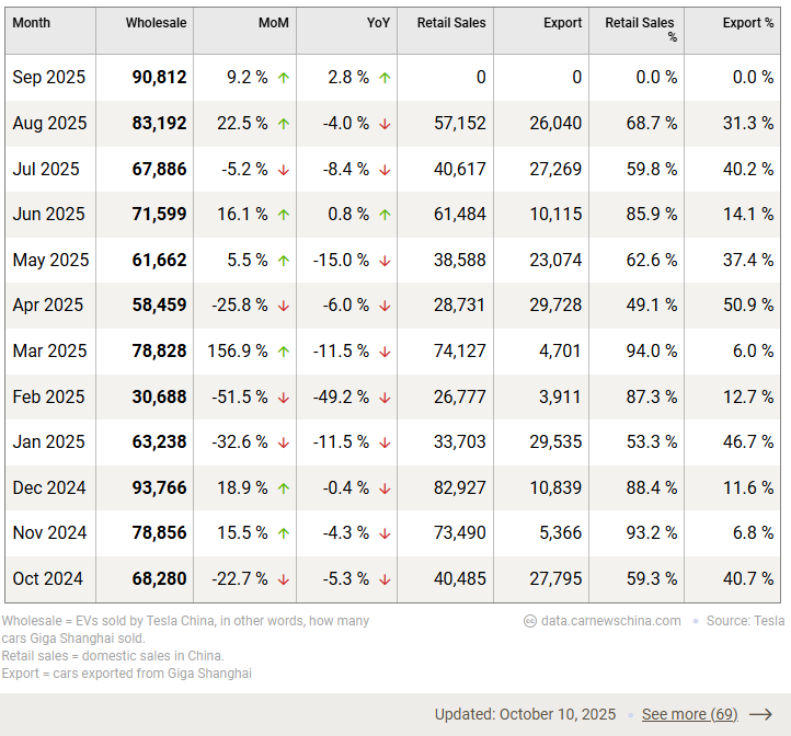 Tesla China sold 90,812 cars in September, up 9.2% from August and 2.8% up from the same month last year. Between January and September, Tesla China sold 606,364 vehicles, down 10.3% from the same period the previous year.