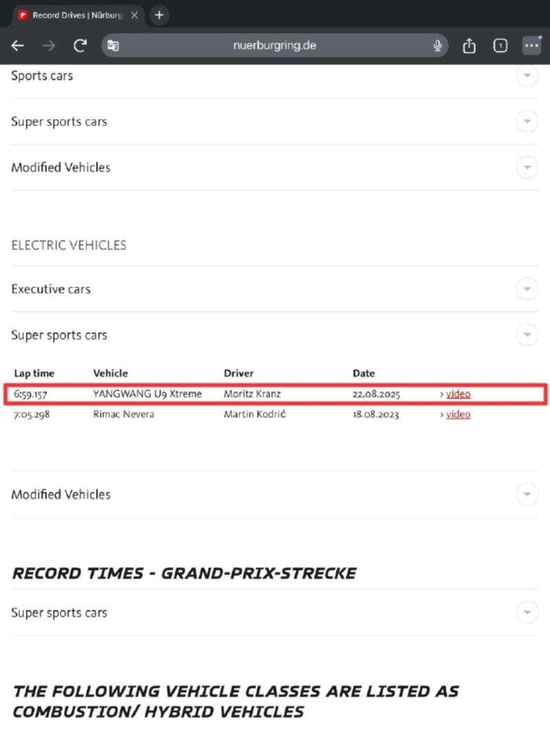 BYD’s premium brand, Yangwang, announced that the U9 Xtreme has been officially listed on the Nürburgring Nordschleife production car leaderboard with a lap time of 6 minutes 59.157 seconds. The certification formally recognises the model as the fastest production electric vehicle at the circuit and confirms its “dual first” status for top speed and lap time.